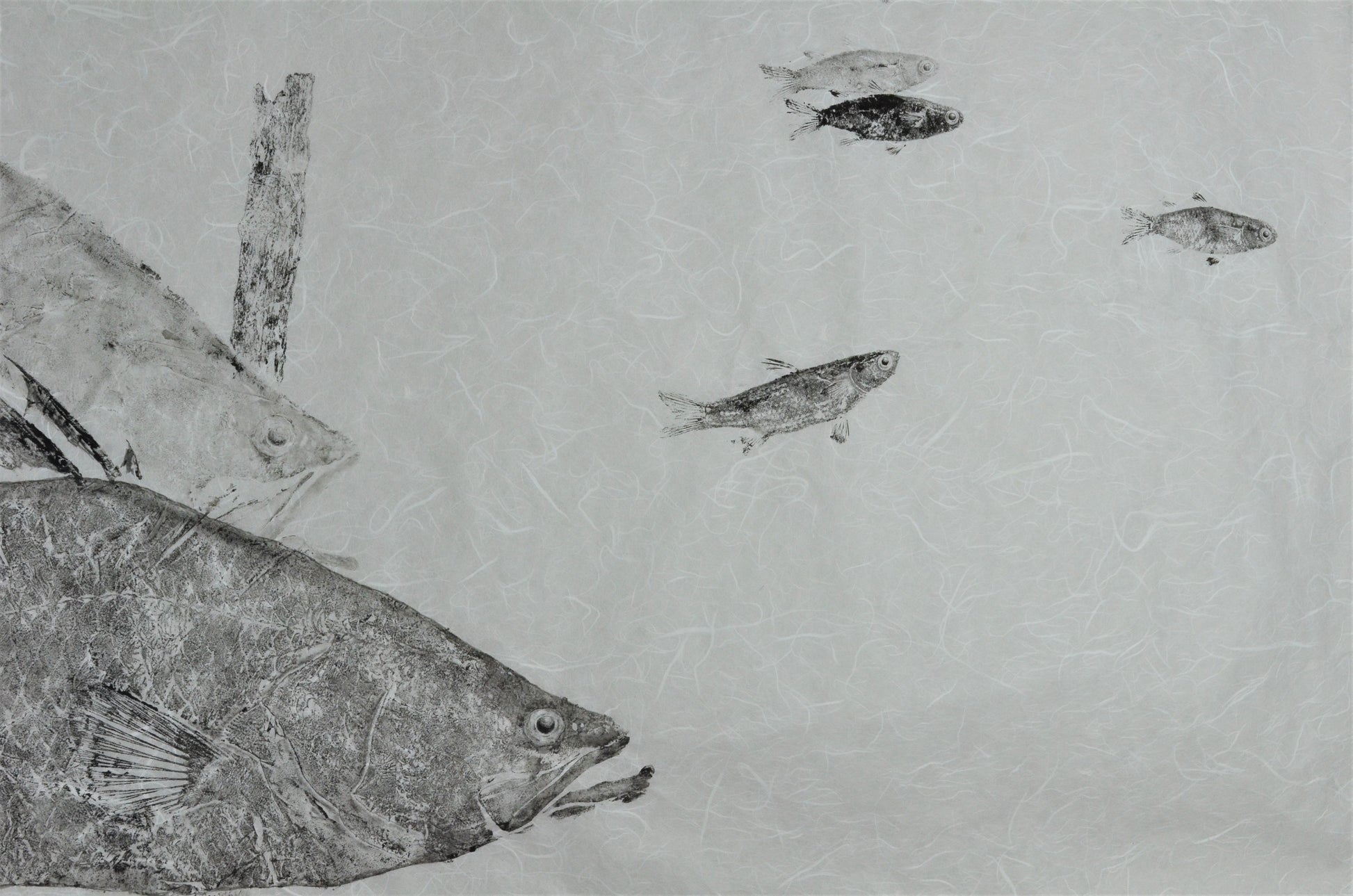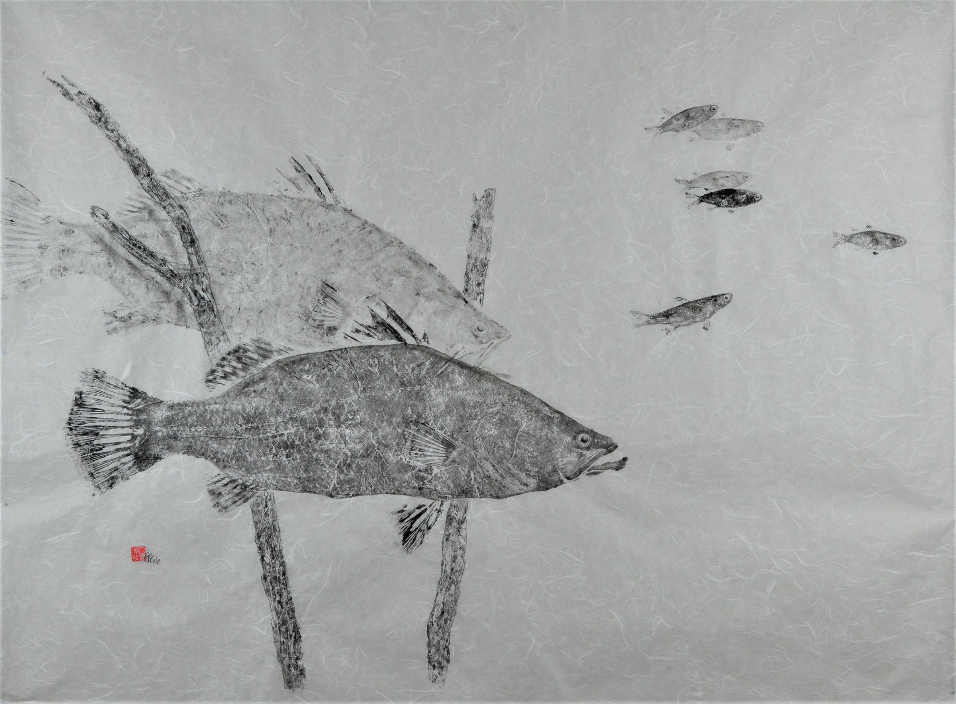 This composite piece includes gyotaku prints of Barramundi, Mullet and tree branches to create a scene reflecting the nature of Barramundi.