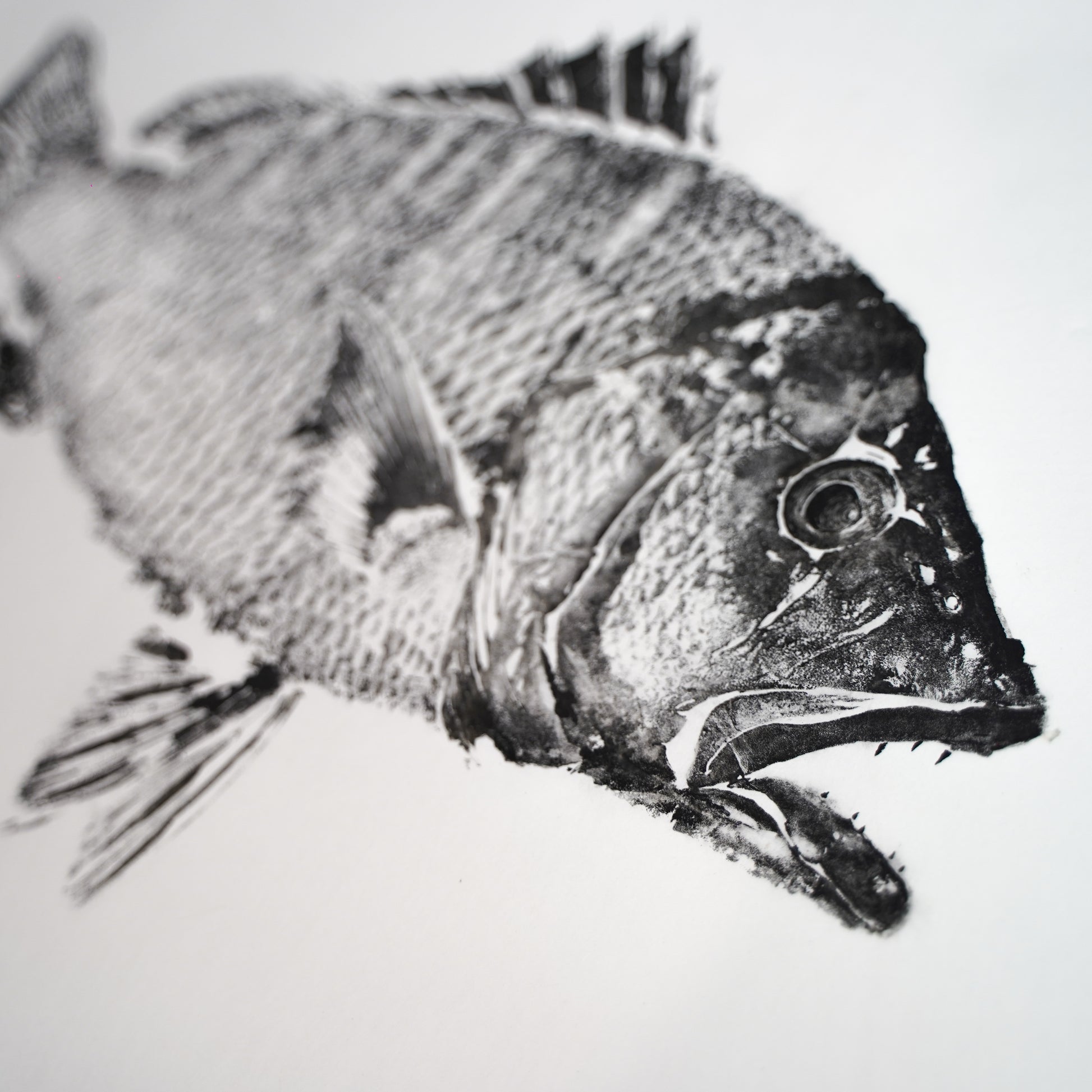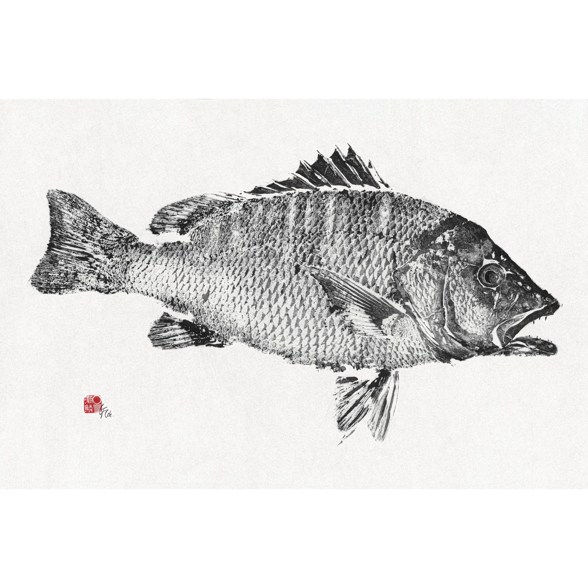 This 58cm Mangrove Jack was speared along the coastline of the Dampier Peninsula north of Broome. The original artwork was hand printed on Mulberry Washi using traditional Sumi Ink capturing a one-off imprint of the fish. The reproductions of this artwork are printed on the highest quality Japanese Washi paper to ensure they are as close to an original artwork as possible. Sizes available are A1 (841 x 594mm), A2 (594 x 430mm), A3 (420 x 297mm) and A4 (297 x 210cm).
